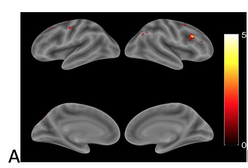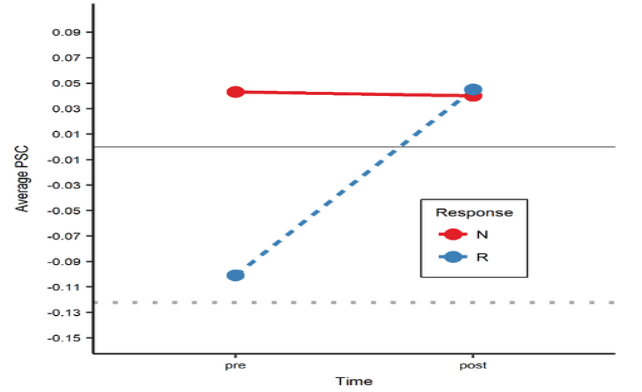 Neurovascular changes after treatment. In order to examine the neurovascular and cognitive changes associated with anomia treatment, an fMRI picture-naming task was used to examine 16 regions of interest in 26 patients with chronic aphasia, before and after 12 weeks of semantic naming treatment. Ten control patients, who did not receive treatment, and 17 healthy controls were also scanned. We found that, naming therapy resulted in a significant increase in cortical activation (see Figure 1), an effect that was largely driven by patients who responded most favorably to treatment (see Figure 2), as patients who responded less favorably (as well as those who did not receive treatment) had little change in activation over time. Relative to healthy controls, patients had higher pre-treatment activation in the bilateral inferior frontal gyri (IFG) and lower activation in the bilateral angular gyri; after treatment, they had higher activation in bilateral IFG, as well as in the right middle frontal gyrus. These results suggest that the predominant effect of beneficial naming treatment was an upregulation of traditional language areas and their right hemisphere homologues and, in particular, regions associated with phonological and semantic/executive semantic processing, as well as broader domain general functions.