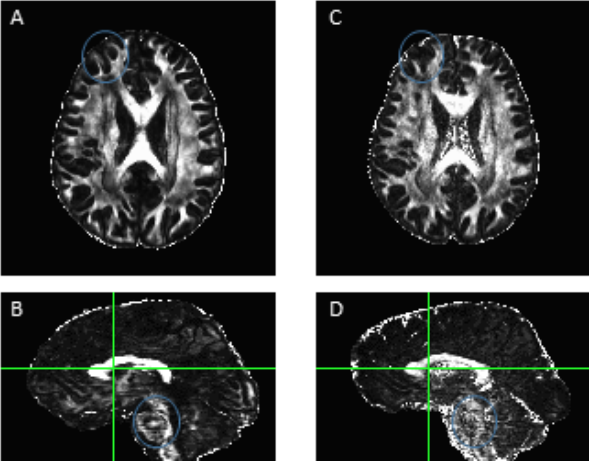 Diffusion image processing and analysis. We developed our own advanced diffusion processing pipeline (ADPP) that follows similar steps to the diffusion pipeline data in the FSL software package (FMRIB, Oxford University) but allows greater spatial mapping in order to maintain the resolution of the acquired data. Image processing methods were implemented primarily using AFNI and Camino (http://afni.nimh.nih.gov/afni), (http://camino.cs.ucl.ac.uk). Processing consists of multiple steps that obtained orientation dispersion metrics for grey matter and “free-water” estimates of the fractional anisotropy (FA) in both grey and white matter. ROIs (e.g., regions within spoken naming, orthographic, and sentence processing networks) are used to extract the DTI indices of white matter integrity and then each ROI is masked to include only white matter. The resultant, ROI-specific DTI metrics, are then stored in the database and compared between time points. Whole brain analyses are also conducted due to the higher quality of our diffusion data and Figure 2: Example of the hypo- (blue) and normal (yellow) perfused regions in two different stroke participants. The lesion mask generated by our automatic segmentation algorithm is shown in red. An additional left hemisphere mask is used to limit analysis of the hypo-perfused tissue. Figure 3: ADPP results in A and B, FSL output results in C and D. We have developed a pipeline that calculates the Neurite Orientation Dispersion and Density Imaging (NODDI) metrics, which provides an estimate of the FA without the contamination of “free water” in each voxel. Using our improved diffusion pipeline, the FA maps are much sharper and allow for better detection of the skeleton. Probabilistic DTI fiber tracking is also conducted using the probabilistic diffusion tractography software, which accounts for crossing fibers. The ROIs masked for white matter will serve as seed and waypoints to examine language network pathways.